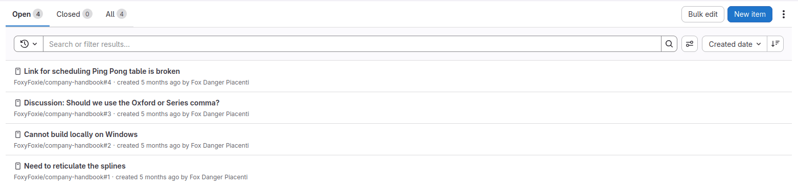 A listing of issues, each one with its own title. There is, additionally, two buttons in the upper-right, “Bulk edit” and “New item”