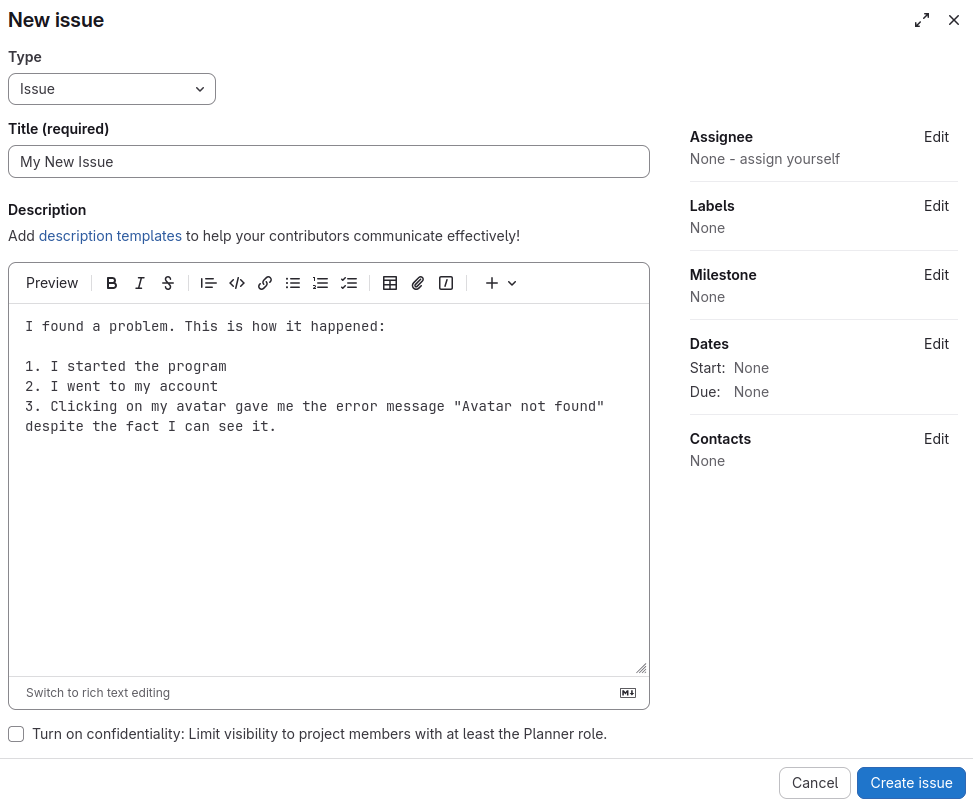 You don’t find any existing issues that describe the bug you noticed, so in this step, you’ll create a new one.